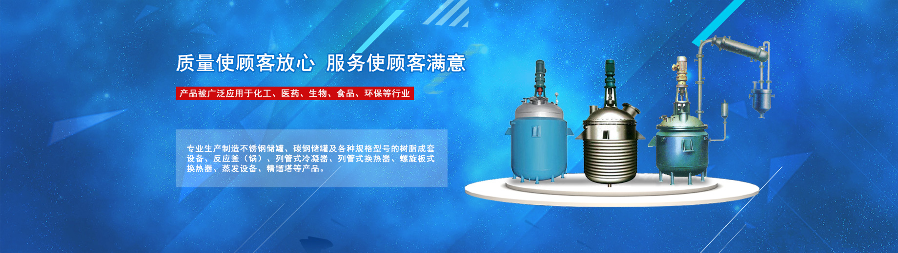 公司專業(yè)生產(chǎn)制造不銹鋼儲罐、碳鋼儲罐及各種規(guī)格型號的樹脂成套設備、反應釜(鍋)、列管式冷凝器、列管式換熱器、螺旋板式換熱器、蒸發(fā)設備、精餾塔等產(chǎn)品,被廣泛應用于化工、醫(yī)藥、生物、食品、環(huán)保等行業(yè)。